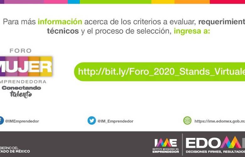 Para mayor información se pueden consultar las redes sociales oficiales de la Secretaría, en Facebook como @SedecoEdomex @IMEmprendedor, en Twitter a través de @SedecoEdomex @IM_Emprendedor, y en la página de Conexión Emprendedora https://conexionemprendedora.edomex.gob.mx/.