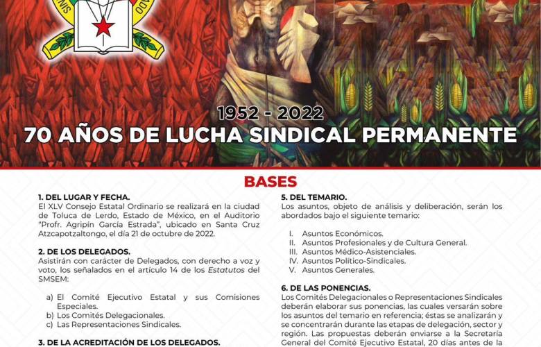 En la ceremonia protocolaria del Consejo Estatal a celebrarse el líder del SMSEM y el Comité Ejecutivo Estatal 2021-2024 rendirán su Primer Informe de Trabajo
