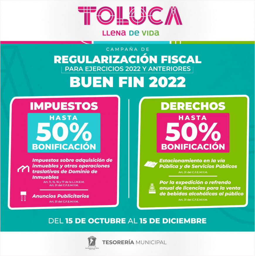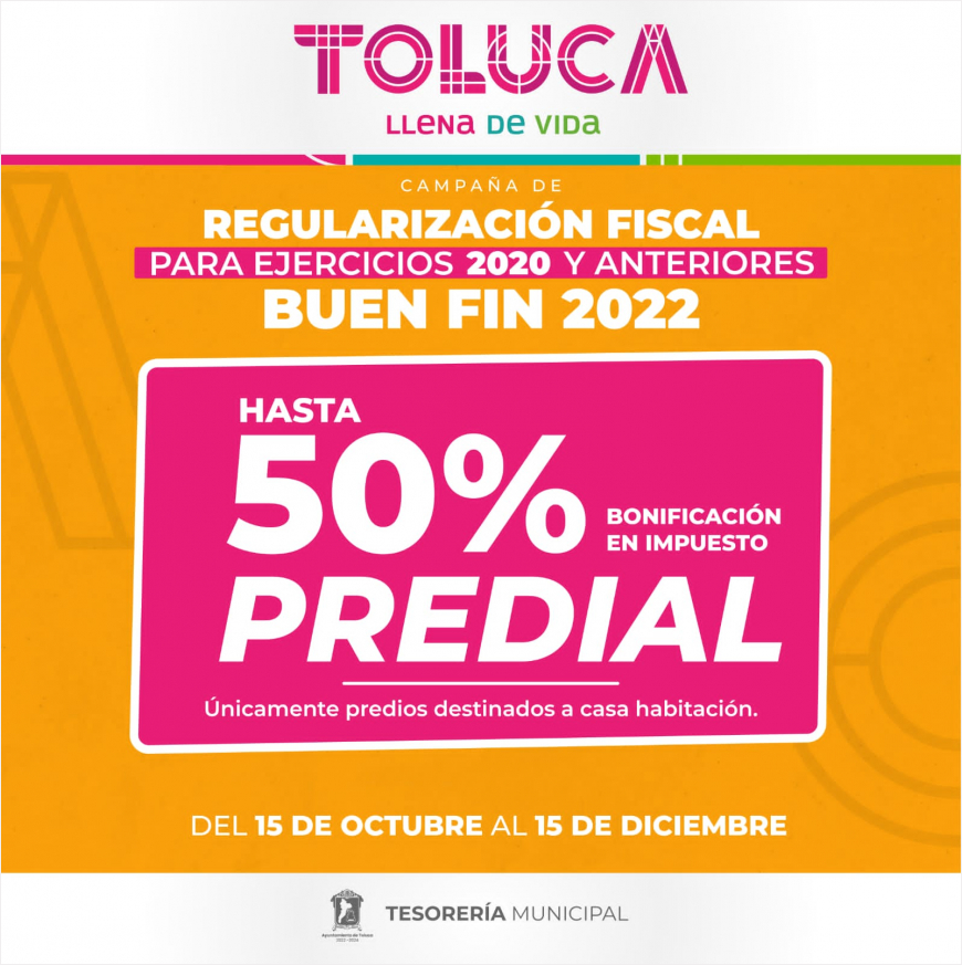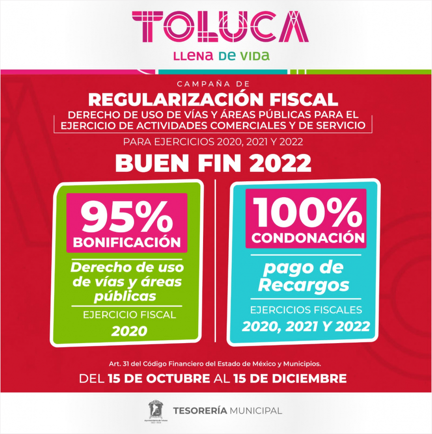 El Presidente Municipal de Toluca, Raymundo Martínez Carbajal, y el Cabildo, aprobaron la campaña de regularización fiscal para ejercicios 2022 y anteriores, que aplicará una bonificación de hasta el 50% en el pago de impuestos y derechos y la condonación de hasta el 100% en multas y recargos para los contribuyentes que presenten rezagos en el pago de contribuciones municipales.