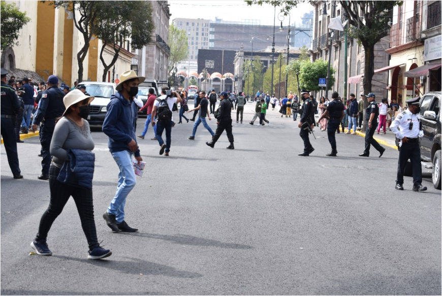 Además se realiza en todo momento un patrullaje preventivo y el patrullaje pie a tierra de 80 elementos que recorren el Portal 20 de Noviembre, Portal Madero, Portal Reforma, Portal Constitución, Av. Independencia y Concha Acústica (Belisario Domínguez).