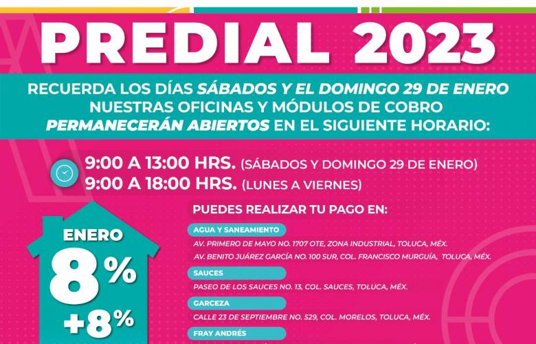 La atención al contribuyente en las oficinas y módulos de cobro es de lunes a viernes de 9:00 a 18:00 horas, los sábados, así como el domingo 29 de enero de 9:00 a 13:00 horas.