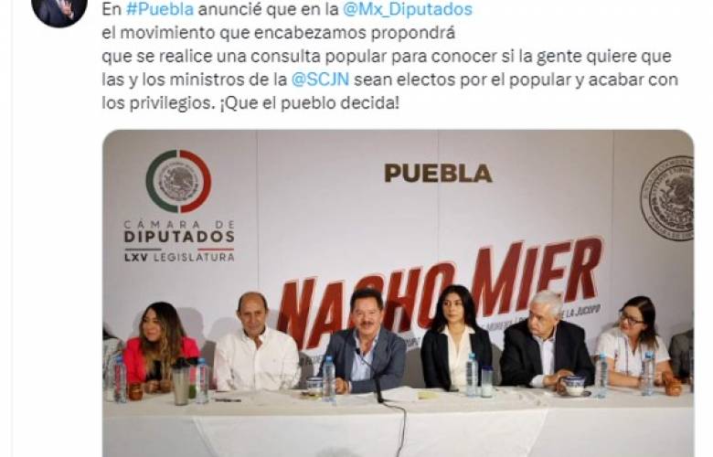 “En Puebla anuncié que en la Cámara de Diputados el movimiento que encabezamos propondrá que se realice una consulta popular para conocer si la gente quiere que las y los ministros de la SCJN sean electos por el popular y acabar con los privilegios. ¡Que el pueblo decida!”, destacó a través de redes sociales.