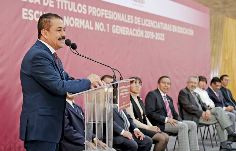 El Gobierno de la Maestra Delfina Gómez Álvarez redignificará la profesión de las y los maestrosnormalistas, aseguró Miguel Ángel Hernández Espejel, Secretario de Educación, Ciencia, Tecnología e Innovación, durante la entrega de títulos profesionales a estudiantes de la Escuela Normal No. 1 de Toluca.