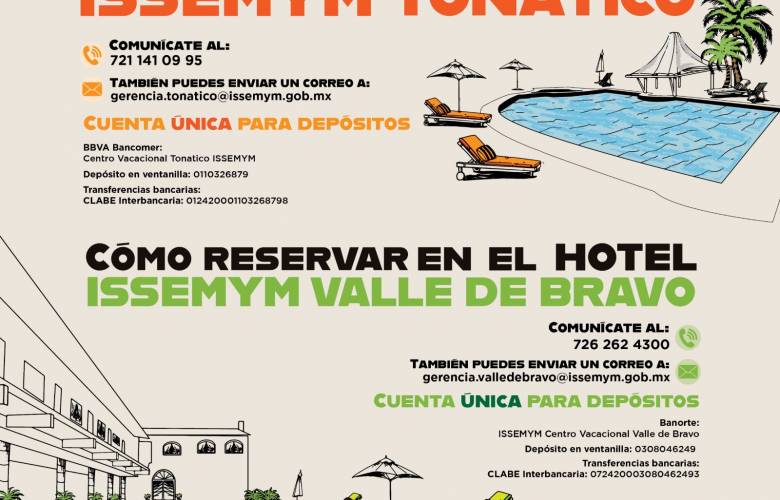 La institución, a través de la Dirección de Prestaciones, hace un atento llamado para no caer en este tipo de fraudes y reitera que la única vía para reservar una habitación en cualquiera de sus dos hoteles es mediante los teléfonos: 721-141-0995, o bien al correo electrónico gerencia.tonatico@issemym.gob.mx; así como al 726-262-4300 y en gerencia.valledebravo@issemym.gob.mx.