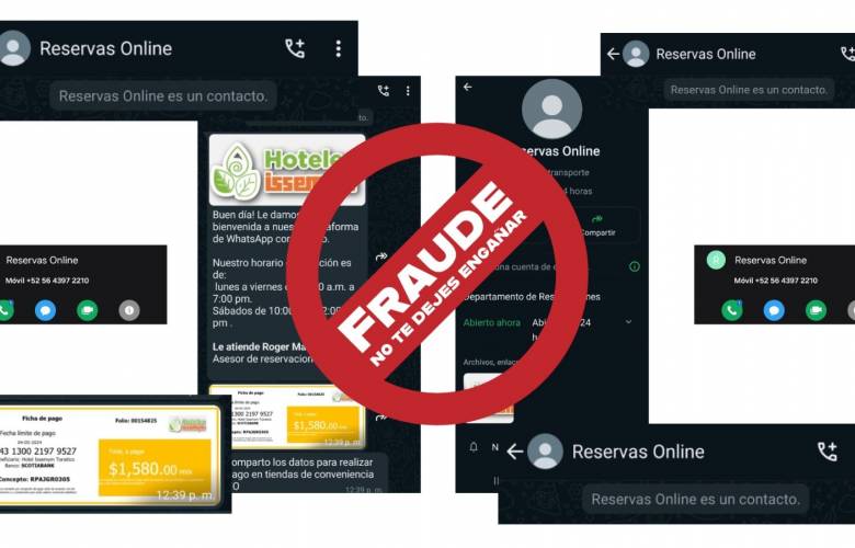 Posteriormente solicitan al interesado efectuar un depósito o transferencia bancaria a través de una ficha “falsa”, la cual previamente le fue enviada por la aplicación de mensajería electrónica WhatsApp, desde varios números, principalmente identificado con el +52 56-4397-2210 denominados “Reservas On-line”, los cuales son apócrifos.