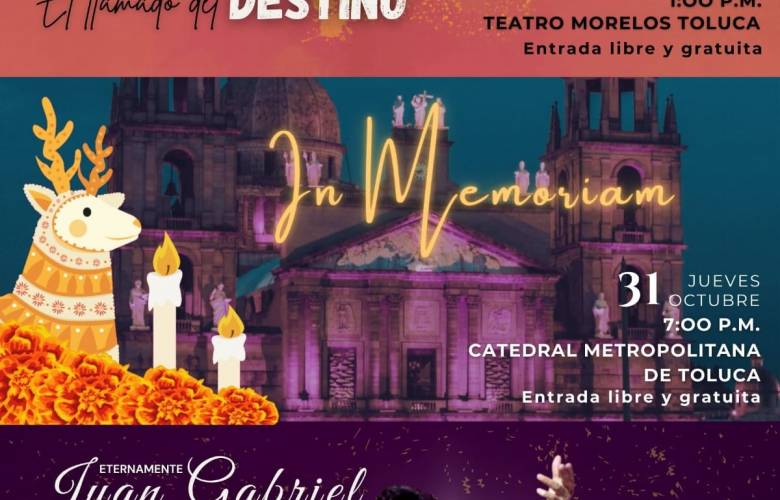La celebración continuará el jueves 31 de octubre con In Memoriam en la Catedral a las 19:00, un homenaje a las personas que ya no se encuentran con nosotros pero que las recordamos con cariño y amor; mientras que el 2 de noviembre, las familias toluqueñas y visitantes podrán disfrutar de las mejores canciones del Divo de Juárez con el espectáculo Eternamente Juan Gabriel con las voces de Ana Casillas y Harold Guerra en el Teatro Morelos, a las 19:00.