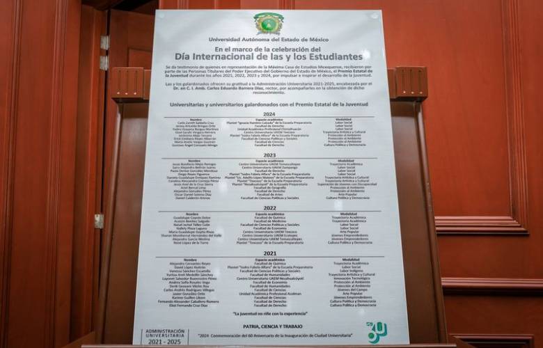 En el marco de la celebración del Día Internacional de las y los Estudiantes, la Universidad Autónoma del Estado de México (UAEMéx) develó una placa del testimonio histórico de universitarias y universitarios que recibieron por parte del Poder Ejecutivo del Gobierno de la entidad el Premio Estatal de la Juventud en los años 2021, 2022, 2023 y 2024.