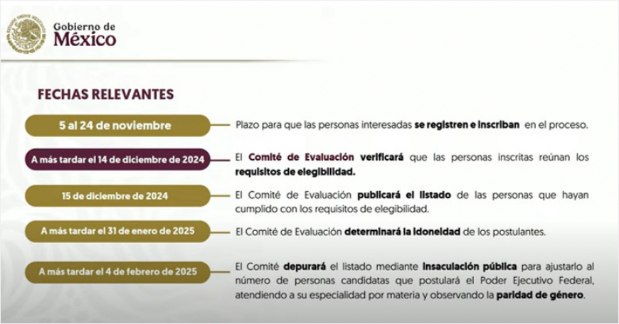 Los Comités de Evaluación verificarán que las postulaciones cumplan con los requisitos de elegibilidad. A mediados de diciembre se publicarán las listas depuradas de aspirantes elegibles, a partir de las cuales se hará luego una insaculación.