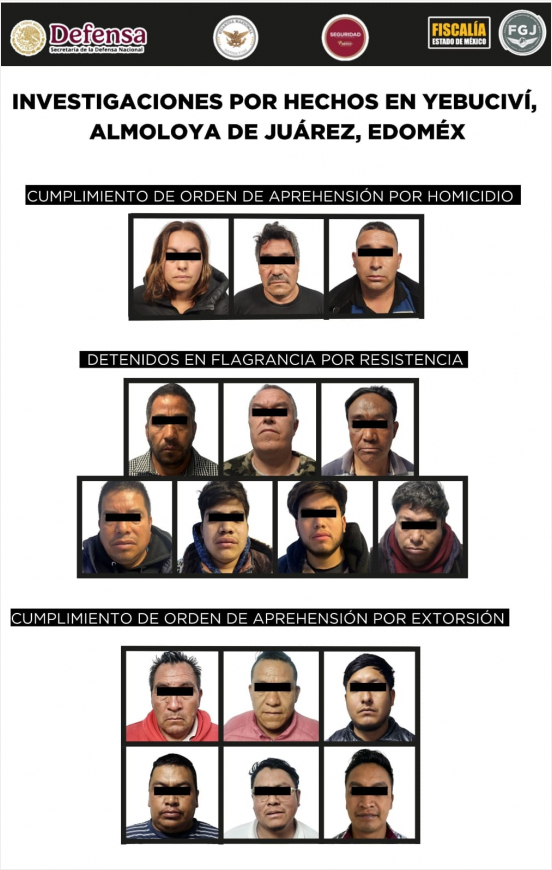 La Fiscalía General de Justicia del Estado de México, en coordinación con elementos de la Secretaría de la Defensa Nacional (DEFENSA), Guardia Nacional (GN) y Secretaría de Seguridad estatal (SSEM), detuvieron a 16 individuos relacionadas con diversos hechos delictivos registrados en Almoloya de Juárez, entre ellos el homicidio de cuatro personas ocurrido el pasado 15 de diciembre en la comunidad de Yebuciví.