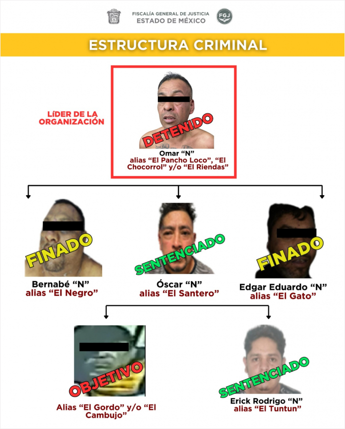 Diversas indagatorias establecieron que en el grupo delictivo de Omar “N” y/o Tomás Alejandro “N” y/o Erik “N”, también participaba Oscar “N” alias “Santero” y el 22 de enero del año 2021, ambos sujetos participaron en un robo con violencia y posterior homicidio de dos Policías Municipales de Tlalnepantla, de igual forma integraba la célula delictiva un sujeto identificado como Bernabé “N”, quien murió en ese mismo evento del robo; Edgar Eduardo “N”, privado de la vida en el año 2021 y un individuo de alias “El Gordo”, quien es un objetivo por detener.