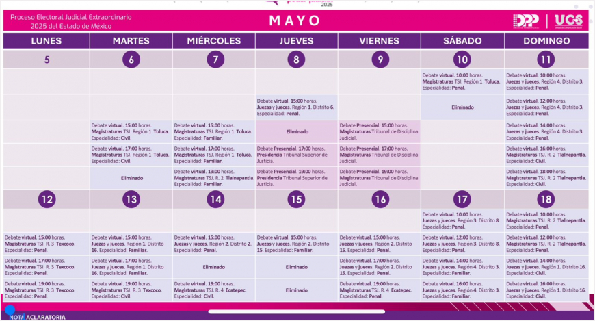 El Instituto Electoral del Estado de México (IEEM) publicó el Calendario con las fechas y horarios en los que se llevarán a cabo los Foros de Debate entre las personas candidatas al Poder Judicial Estatal.