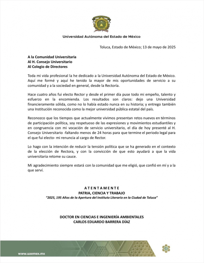 Luego de que los alumnos de la Universidad Autónoma del Estado de México (UAEMéx) iniciaran movilizaciones la semana pasada para exigir un proceso legal justo, lelgando a extender un paro de actividades en centros universitarios entre rumores de presuntos actos de corrupción e interferencia en el proceso de sucesió a través del impulso auna “aspirante oficial” elegida para ganar la rectoría de la máxima casa de estudios mexiquense, este martes 13 de mayo, el actual rector Carlos Eduardo Barrera Díaz, presentó la renuncia a su cargo.