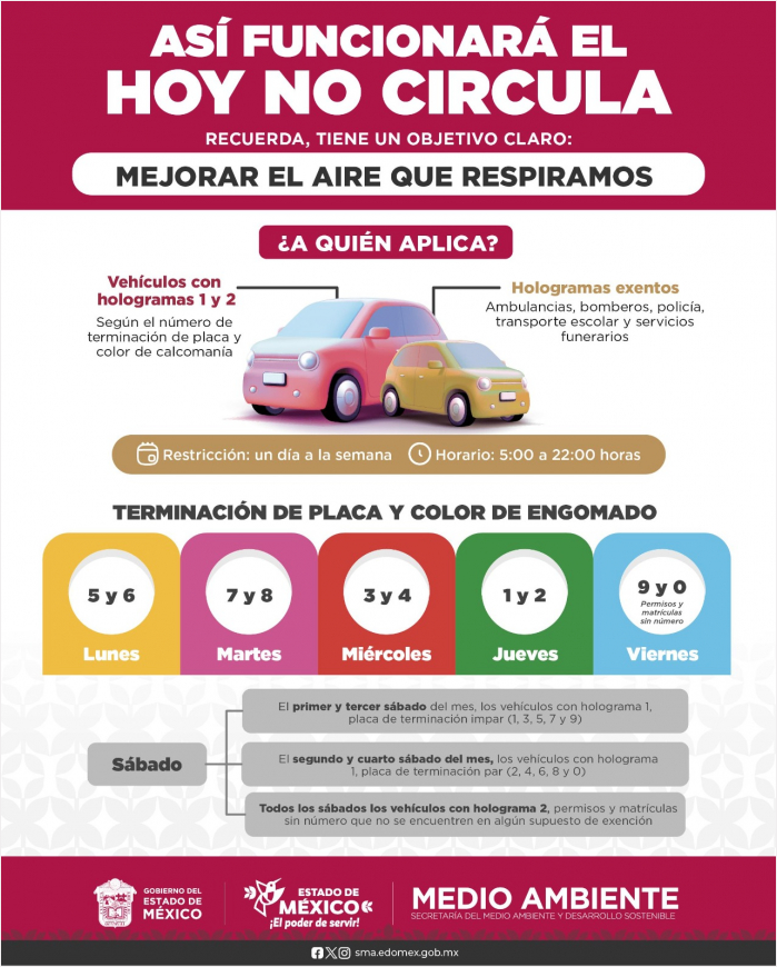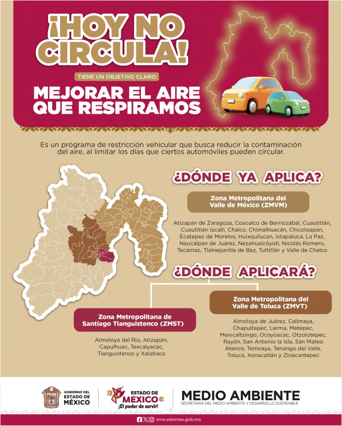 El Gobierno del Estado de México informa que a partir del 1° de julio de 2025 entra en vigor el Programa Hoy No Circula en las zonas metropolitanas del Valle de Toluca y de Santiago Tianguistenco, como medida para mejorar la calidad del aire y proteger el medio ambiente.