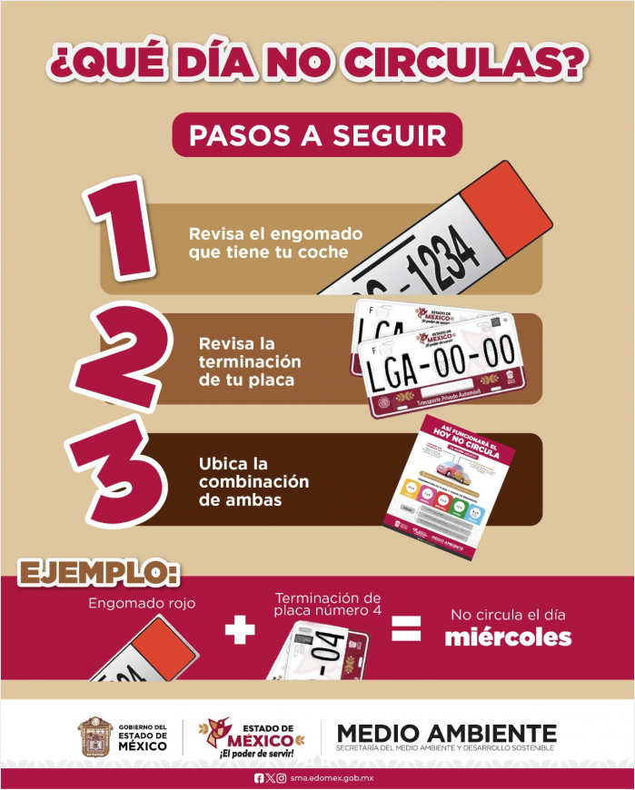 La ciudadanía debe consultar el color del engomado y la terminación numérica de la placa, para identificar el día de restricción en el sitio oficial: sma.edomex.gob.mx