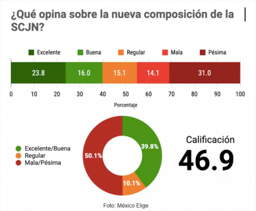 En síntesis la nueva conformación de la SCJN tendría un 46.9 de calificación. Al consolidar las categorías, 50.1% por ciento de los encuestados tiene una opinión negativa (Mala/Pésima) sobre la nueva composición de la SCJN, mientras que solo un 39.8% la ve de forma positiva.
