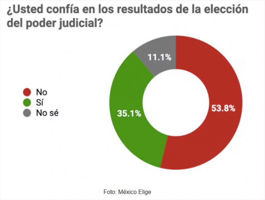 A la pregunta expresa ¿Usted confía en los resultados de la elección del Poder Judicial?, el 53.8% de los entrevistados dijo que no confía en ellos, adicional a eso habría que considerar que en la elección solo participó el 13% del padrón electoral.