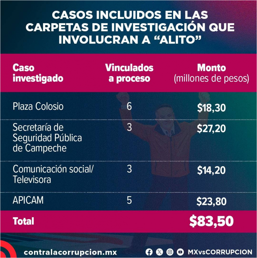 Dentro de las indagatorias están relacionadas otras 17 personas, entre ellas exfuncionarios de la administración de Alito, quienes ya fueron vinculados a proceso; otras dos de ellas incluso obtuvieron un criterio de oportunidad ante la Fiscalía de Campeche para colaborar con las investigaciones.