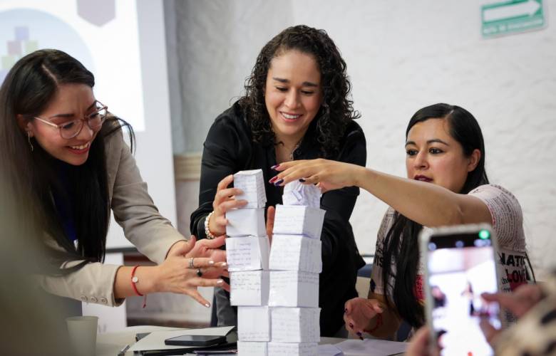 Durante este espacio, las participantes realizaron la dinámica “La Pirámide”, en la que plasmaron en una hoja quiénes son, su historia y sus convicciones. Posteriormente, en equipos compartieron estas experiencias y construyeron una pirámide colectiva como símbolo de que los espacios políticos se edifican de manera conjunta.