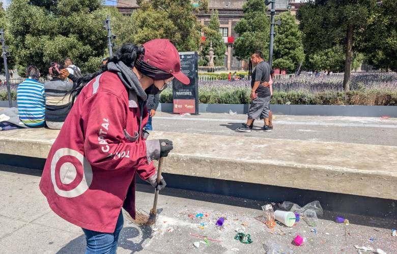Después del tradicional Grito de Independencia y del desfile, realizados para conmemorar el 215 Aniversario del Inicio de la Independencia de México, las y los servidores públicos llevaron a cabo trabajos de barrido manual y recolección, en tanto las barredoras eléctricas recorrieron las avenidas para asear y desinfectar.