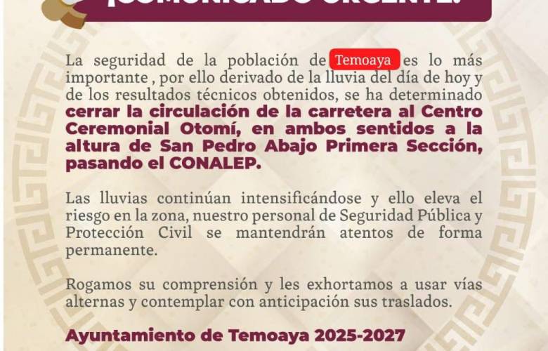 La seguridad de la población de Temoaya es lo más importante, por ello derivado de la lluvia del día de hoy y de los resultados técnicos obtenidos, se ha determinado cerrar la circulación de la carretera al Centro Ceremonial Otomí, en ambos sentidos a la altura de San Pedro Abajo Primera Sección, pasando el CONALEP.