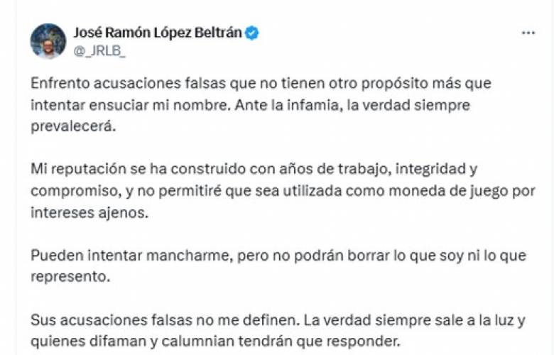 José Ramón López Beltrán, hijo mayor del expresidente Andrés Manuel López Obrador, negó señalamientos sobre presuntas actividades ilícitas y afirmó que su reputación se ha construido con años de trabajo e integridad. A través de un comunicado en redes sociales, advirtió que no permitirá que su nombre ni el de su familia sean utilizados con fines políticos.