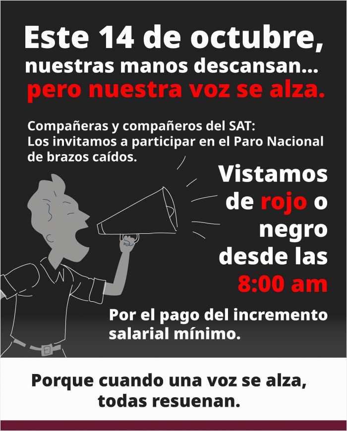 La convocatoria difundida internamente llama a todo el personal adscrito al SAT a participar el martes 14 de octubre a partir de las 08:00 horas, en una protesta pacífica de brazos caídos, portando vestimenta en color rojo o negro como símbolo de unidad y protesta.