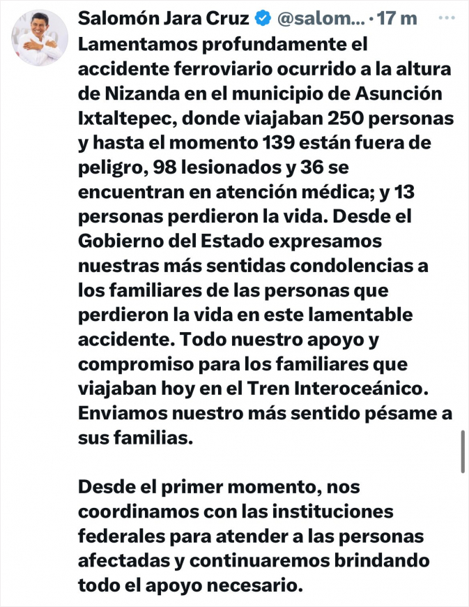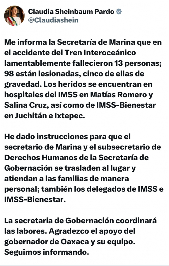 Sin embargo, después de las 18:00 hrs. la Secretaría de Marina, emitió unreporte actualizado, confimando 13 muertos y 98 heridos por el descarrilamiento en Oaxaca del Tren Interoceánico en la Línea Z.
