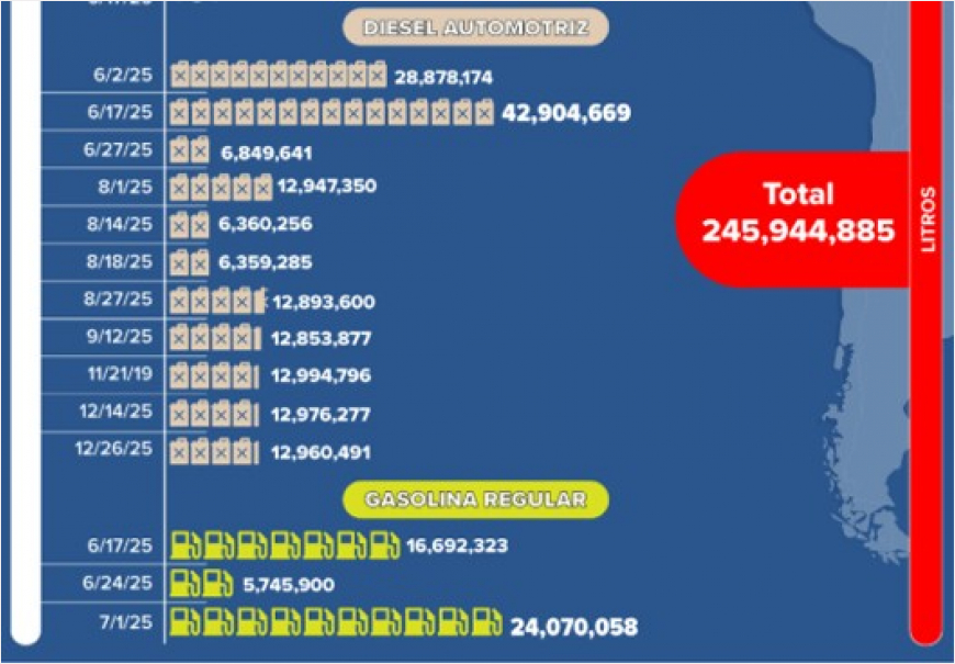 Mientras que de diésel automotriz se enviaron once cargamentos por más de 168.9 millones de litros, los envíos de gasolina regular en tres fechas fueron por poco más de 46.5 millones de litros.