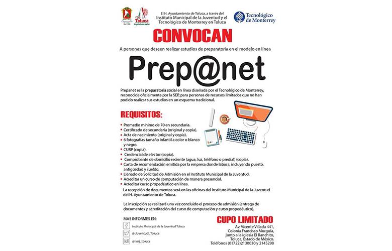 La recepción de documentos será hasta el 8 de febrero en el Instituto Municipal de la Juventud, los aspirantes deberán presentar certificado de secundaria –original y copia- con un promedio mínimo de 70, acta de nacimiento, seis fotografías tamaño infantil a color o en blanco y negro, copia de la CURP, credencial de elector y comprobante domiciliario, carta de recomendación emitida por la empresa donde labora incluyendo puesto, antigüedad y sueldo, llenar la solicitud de admisión, acreditar un curso de computación presencial y un propedéutico en línea. El cupo es limitado.