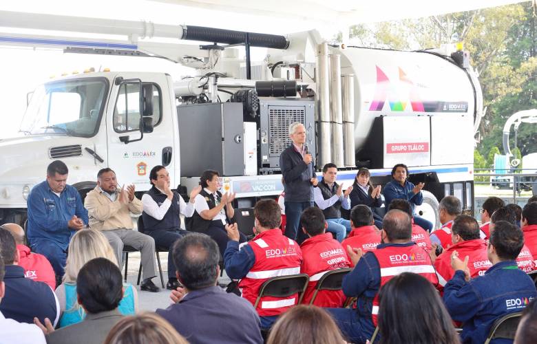 Rafael Díaz Leal Barrueta, Secretario de Obra Pública, señaló que el Grupo Tláloc, que está cumpliendo 10 años de trabajar las 24 horas del día, será fortalecido con la entrega de estos equipos hidroneumáticos, que se suman a los 33 Vactors existentes en los 20 campamentos instalados en territorio mexiquense.